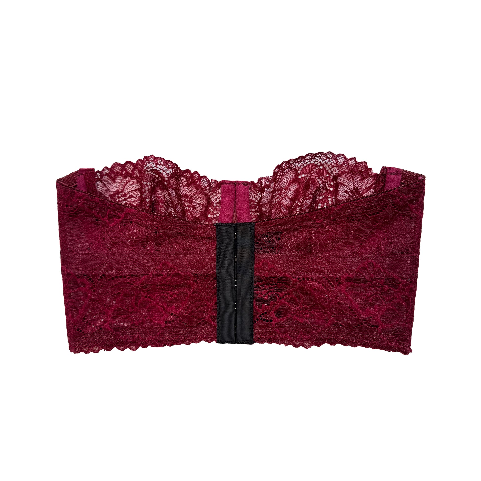 Un bustier en tono borgoña profundo que envuelve la piel con delicadeza. Su diseño sin tirantes resalta naturalmente el escote, mientras el encaje con transparencias sutiles agrega un aire de misterio y encanto. Una pieza pensada para sentirse segura, femenina y elegante en cada detalle.